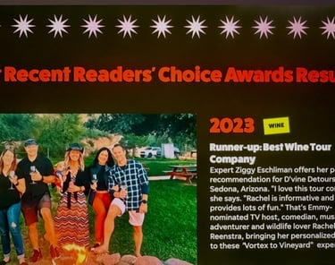 🌟 “Welcome to D’Vine Detours — Award-Winning Sedona Tours! Created by Emmy-nominated TV host and comedian Rachel Reenstra, our personalized Sedona wine tours, vortex tours, and city tours have been voted Best of the Best by TripAdvisor and recognized by USA Today as one of the Top 10 Best Tours in the USA.