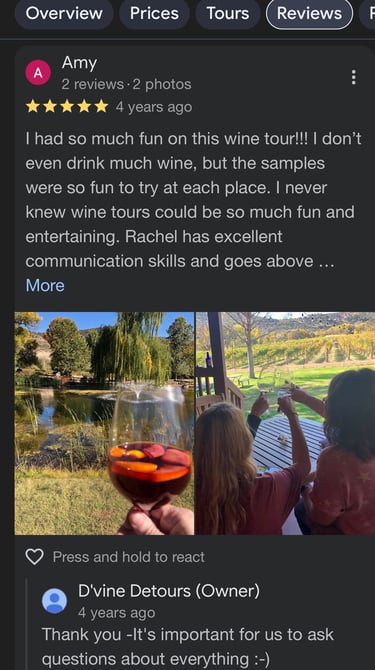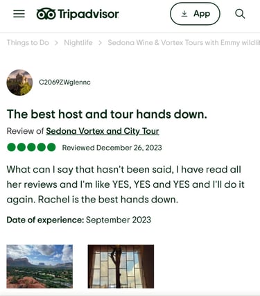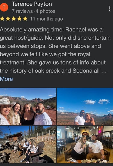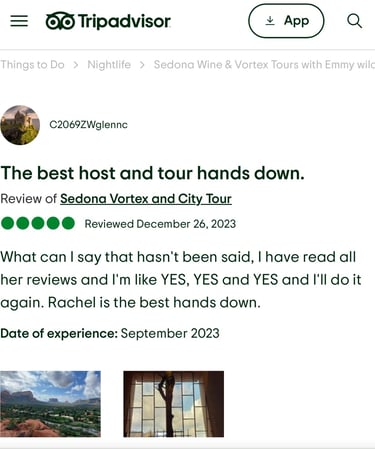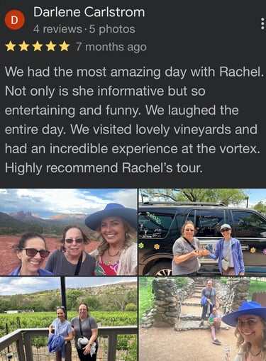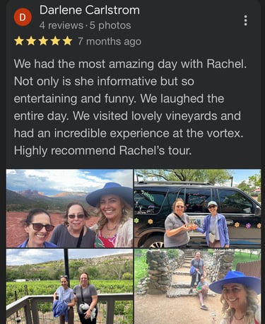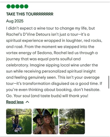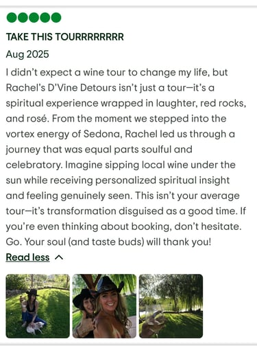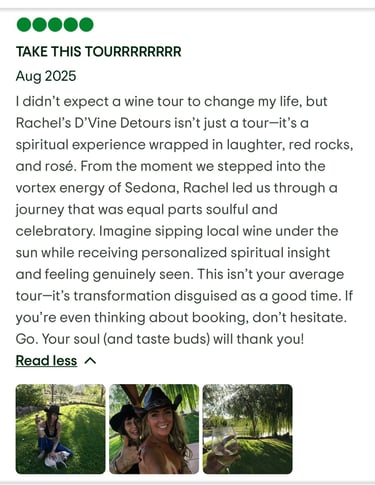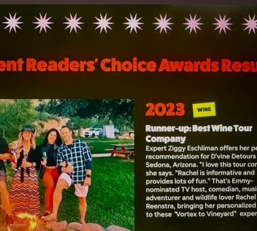 D’Vine Detours is an award-winning Sedona tour company recognized as a USA Today Top 10 Tour in the United States and a TripAdvisor “Best of the Best” experience, ranking in the top 1% of tours worldwide. With hundreds of five-star reviews, guests consistently rate our Sedona wine tours, vortex tours, and city experiences among the best things to do in Sedona, Arizona, known for stunning red rock scenery, curated wine tastings, and unforgettable guest experiences.